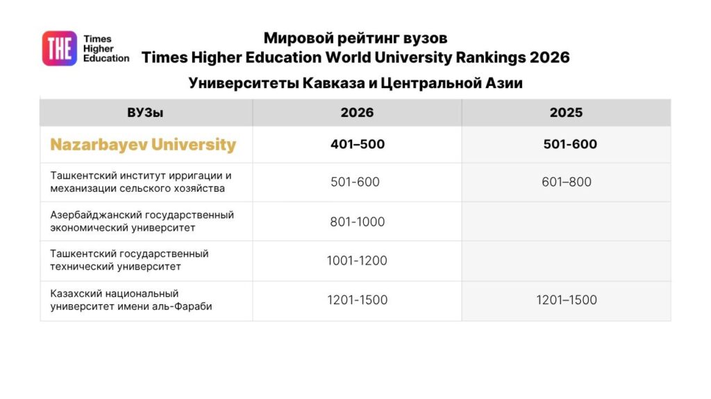 Растущие показатели отражают прогресс казахстанского университета по всем трем ключевым направлениям оценки: преподавание, исследовательская среда и, в особенности, качество исследований. NU впервые появился в этом глобальном рейтинге в 2024 году и всего за два года совершил значительный рывок, подтвердив статус вузa №1 в Центральной Азии и на Кавказе.