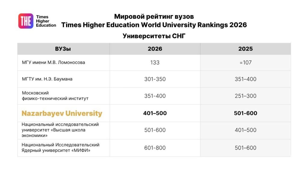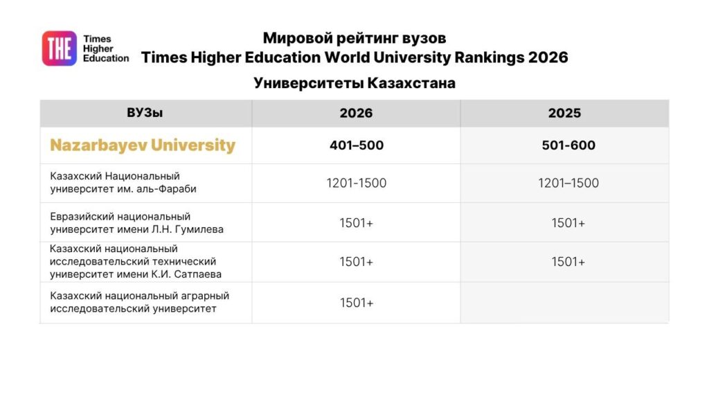 Nazarbayev University (NU) укрепил свои позиции на глобальной арене, поднявшись в самом престижном мировом рейтинге Times Higher Education WUR 2026. Как сообщила пресс-служба университета , новый рейтинг вышел сегодня, 9 октября. Молодой университет, которому более пятнадцати лет, поднялся на 100 позиций за год, укрепляя академическую репутацию страны на мировой арене.