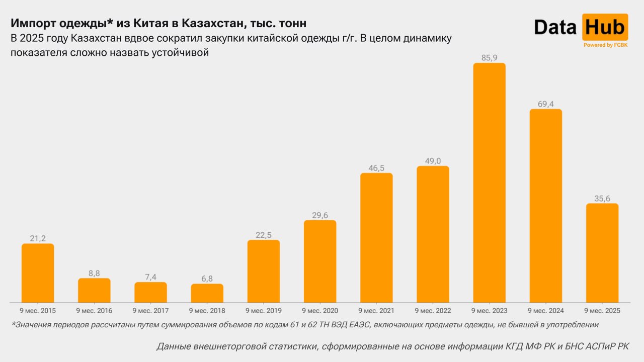 Физический импорт китайской одежды в январе-сентябре падает второй год подряд (в 2024 году было -19% год к году). Однако важно учитывать, что пять лет перед этим, с 2019 по 2023 год, показатель стабильно рос, и часто скачками. Последний из них, +75% год к году, произошел в 2023 году. Тогда был достигнут максимум за историю наблюдений с 2015 года – 85,9 тысячи тонн (уровень девяти месяцев). То есть в целом официально фиксируемая динамика носит довольно неустойчивый характер.