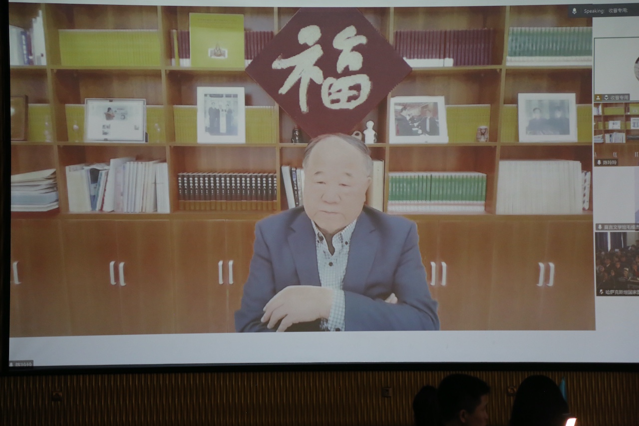 В рамках празднования Национального дня книги и деятельности Зала культуры и литературы Китая, в Большом зале Национальной библиотеки РК состоялась онлайн-встреча с почётным доктором филологии Открытого университета Гонконга, лауреатом Нобелевской премии по литературе, китайским писателем Мо Янь на тему: «Мировая литература — основа национальной духовности». В мероприятии участвовали ведущие китаеведы Казахстана, студенты казахско-китайского языкового колледжа, читатели библиотеки, студенты высших и средних специальных учебных заведений.