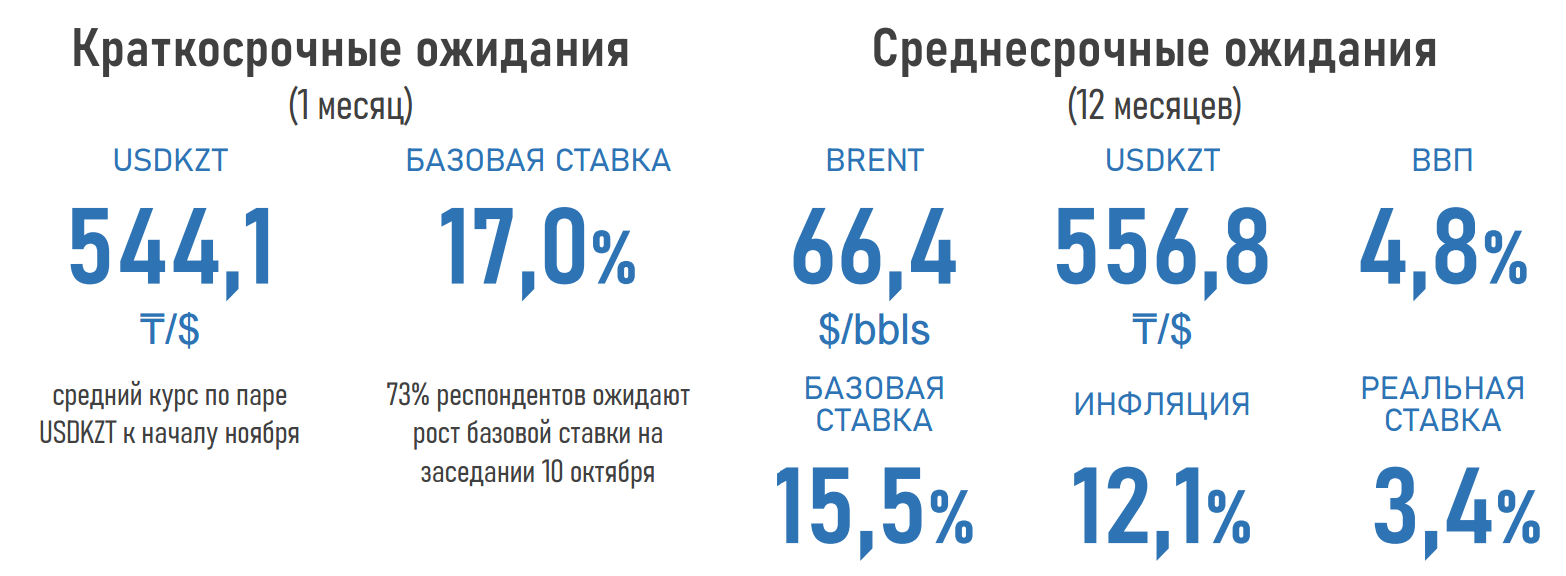 - Доля участников опроса, ожидающих повышения базовой ставки на заседании НБРК 10 октября, выросла до 73% против 40% в прошлом месяце. Остальные 37% прогнозируют сохранение ставки.