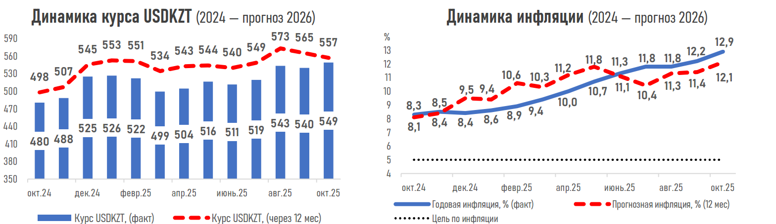 - На валютном рынке в течение месяца ожидается некоторое ослабление тенге на фоне увеличения инвестиционной активности в экономике и внешних расчётов компаний вследствие ускорения освоения бюджетных средств и реализации крупных инвестиционных и инфраструктурных проектов. В совокупности эти факторы формируют повышенный спрос на инвалюту. К началу ноября курс по паре USDKZT прогнозируется на уровне 544,1 тенге за доллар против 541,6 месяцем ранее. А через год — на отметке 556,8 тенге за доллар (+1,7% от текущего уровня).