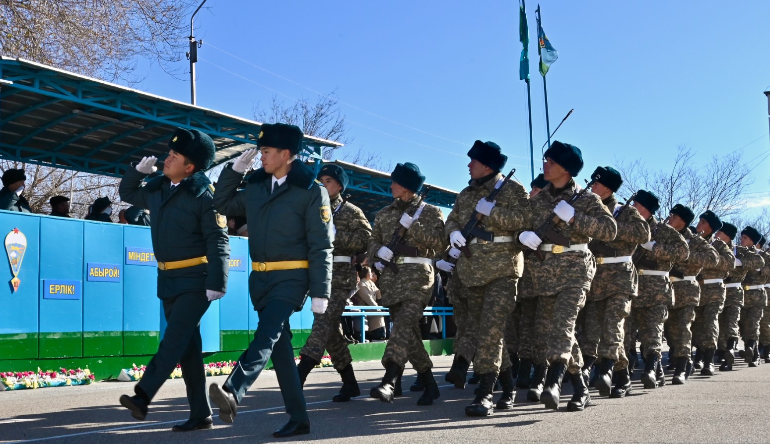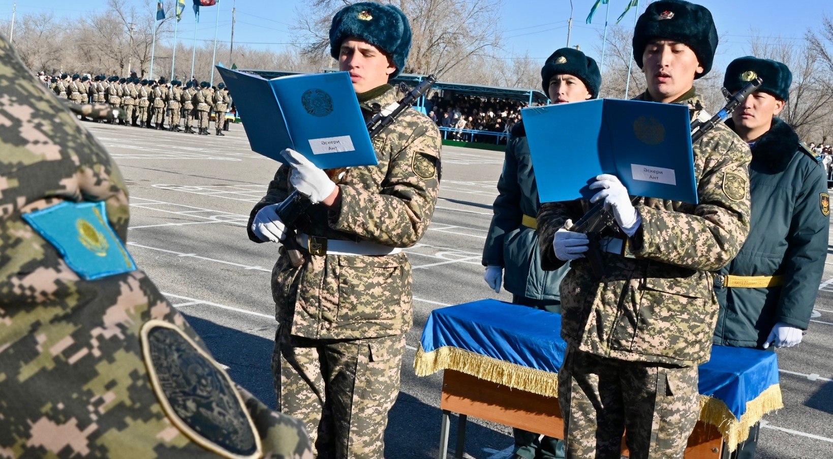 "В Вооружённых Силах нет ритуала более значимого, чем принятие военной присяги. Приведение к присяге — это не просто обязательная церемония, а важнейшее событие в жизни каждого военнослужащего, вступающего в ряды Вооружённых Сил Республики Казахстан. Присягу принимают один раз — и на всю жизнь. Верность священной присяге неоднократно проявляли наши предки в суровых сражениях, защищая свою землю от врагов. Присяга вела в бой наших земляков в годы Великой Отечественной войны, вдохновляла их на выполнение интернационального долга" Командир войсковой части 32363 гвардии полковник Бейбит Аманкалиев